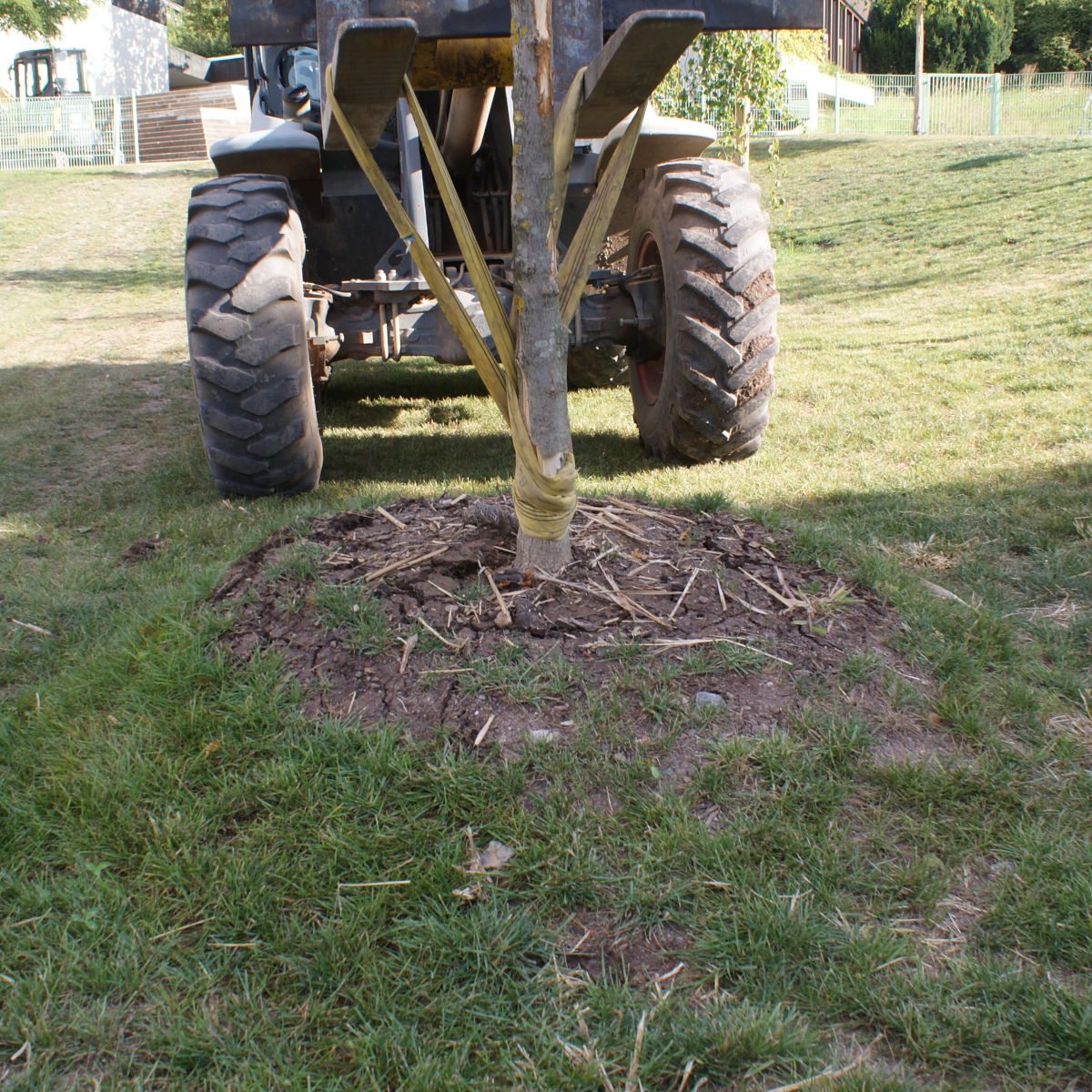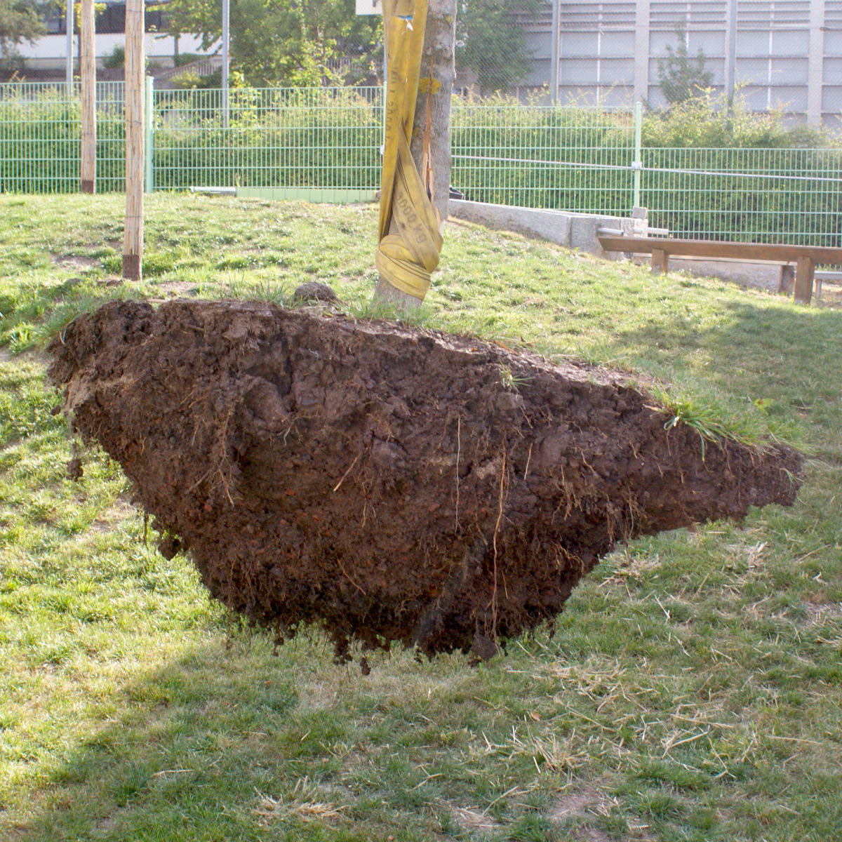 Nur vier Monate später wurde der junge Baum bei einem Unfall mit einem Radlader schwer beschädigt – der Stamm brach. Doch der Wurzelballen blieb fest im Boden. Kein Riss, keine Bewegung. Ein deutliches Zeichen für eine stabile Verankerung.
