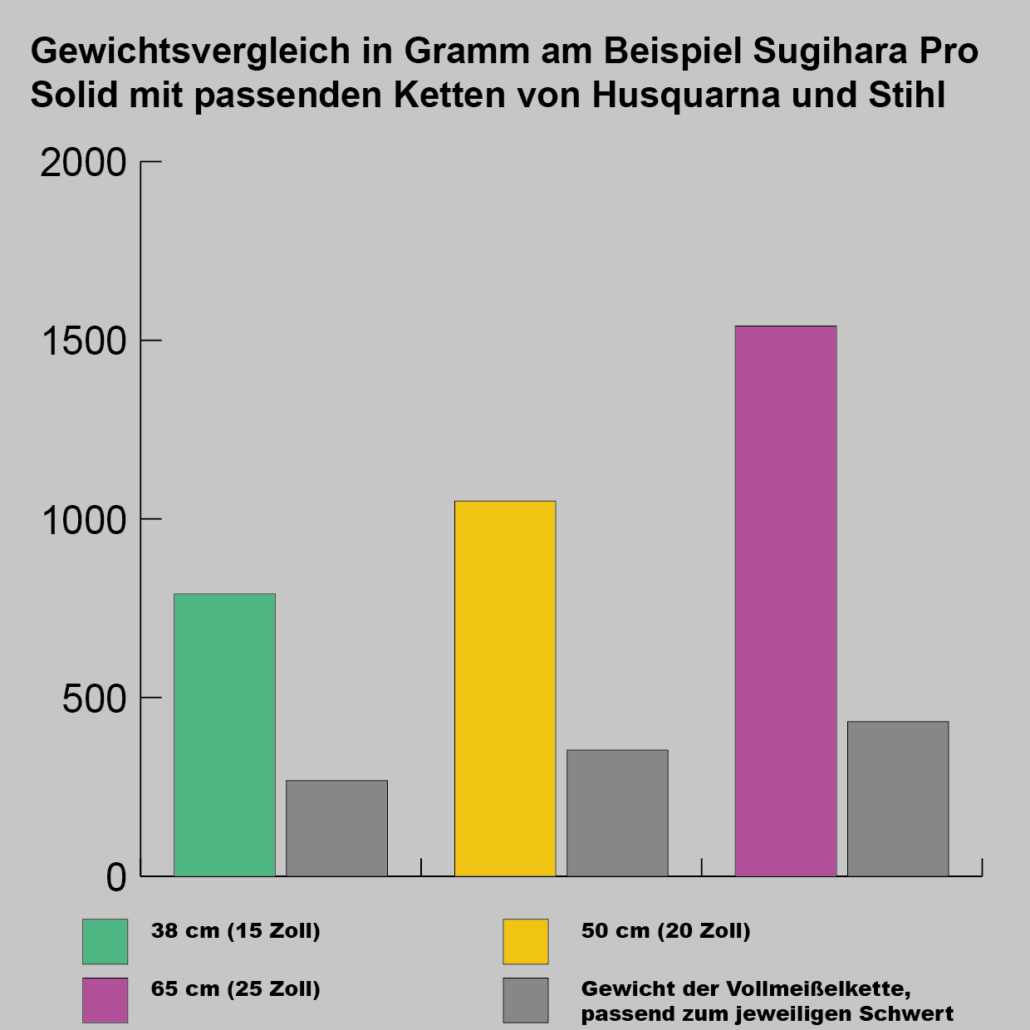 Unabhängig von der Schwertbreite, macht es auch einen Unterschied, ob Sie ausschließlich Weichholz oder vorwiegend Hartholz bearbeiten. Aber auch mit einem schmalen Schwert stößt eine 2,7-KW-Säge spätestens ab etwa 45 cm bei Hartholz an seine Grenzen. Mit „normaler“ Schwertbreite (1,5 mm) sollten Sie also auch bei einer 562 XP, die 3,5 KW = 4,8 PS leistet, dauerhaft kein Schwert verwenden, das länger als 50 cm ist.